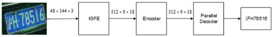 The proposed license plate recognition model PDLPR is shown in Figure 2, which consists of three main modules: the Improved Global Feature Extractor (IGFE), the Encoder, and the Parallel Decoder. All the input license plate images were initially resized to 48 × 144. In the IGFE module, feature extraction was performed on an image and features were converted into a feature vector of 512 × 6 × 18. In the Encoder module, the position encoder encoded the position of the feature map, added it to the image feature vector, then encoded the vector using Multi-Head Attention to produce a feature vector. In the Parallel Decoder module, the Multi-Head Attention of the decoder was employed to decode the output feature vector from the encoder in order to predict the license plate sequence.