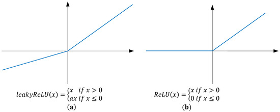 The activation function made use of the leakyRelu [59] shown in Figure 5a rather than the Relu [60] shown in Figure 5b. The reason is that when the input of the Relu function is negative, the output is always 0, and its derivative is also 0. This tends to cause dead neurons, which means that the neurons no longer learn and the parameters no longer change. The leakyRelu is given a smaller slope value for the case where the input is negative to avoid the occurrence of death neurons.