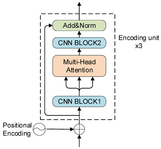 As shown in Figure 6, the Encoder in this paper consisted of three encoding units connected by residuals, and each unit contained four submodules: CNN BLOCK1, Multi-Head Attention, CNN BLOCK2, and Add&Norm. The CNN BLOCK1 and CNN BLOCK2 structures are the same as in Section 3.2.1, but with a few differences that will be explained later.
