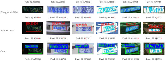 AOLP [47] consists of 2049 license plate images from the Taiwan Province of China. According to complexity and shooting conditions, the dataset is divided into three subsets: access control (AC), law enforcement (LE), and road patrol (RP). AC contains 681 images, LE contains 757 images, and RP contains 611 images. Each license plate consists of six characters, each consisting of a letter or number (excluding the “O”). As the license plate style of the Taiwan Province is completely different from that of other Chinese provinces, we conducted three sets of experiments on this dataset, each using two of its three subsets for training and the remaining one for testing.