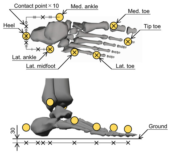 Locations of the contact points. The cross marks represent the contact points, and the circle symbols represent the reflective markers used in the optical motion capture. A total of 20 contact points, 10 per foot, were placed in the calcaneus and toe segments. The horizontal locations of the contact points were derived from the marker positions based on the marker set of the musculoskeletal model employed in this study, and the vertical locations of the contact points were set to have an offset of 30 mm toward the ground during static standing. Unit: mm.