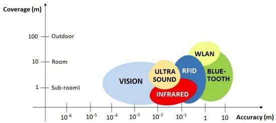 Indoor Positioning Systems (IPS)—IPS typically focus on tracking individuals within a specific area. Their data can be integrated with a hospital’s digital twin to enhance patient safety and improve staff efficiency in locating patients for care or emergencies. Technologies that enable precise location tracking within buildings facilitate personalized services and navigation [23]. These technologies are mainly based on imaging, infrared, ultrasound, Wi-Fi, radio frequency identification (RFID), and Bluetooth. Figure 2 (adapted from [24]) depicts these technologies in terms of accuracy and coverage [24].