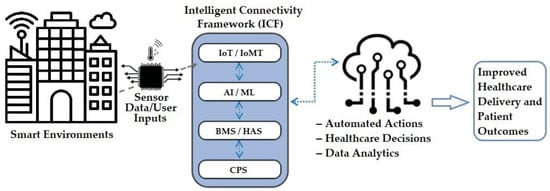 IoT and IoMT—The Internet of Things forms the backbone of smart environments, enabling seamless communication between interconnected devices. In healthcare, the IoMT extends this connectivity to medical devices, facilitating remote monitoring and data collection. It encompasses a diverse range of medical devices and sensors that collect, transmit, and process medical data. IoMT devices can be implanted within the body (wearables), attached to the body (wearables), or embedded in the environment.