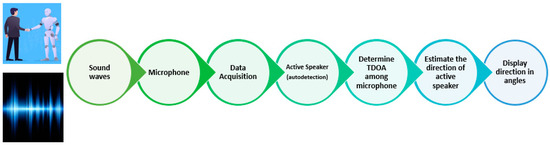 Upon confirming a received signal as a signal of interest, data from microphones undergo processing, including band-pass filtering. Time Difference Of Arrival (TDOA) between microphones is measured to determine the sound source location, often using the Generalized Cross-Correlation with Phase Transform weighting function (GCC-PHAT) method [67] (Figure 3).