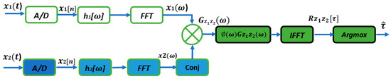 Complex conjugation is denoted by (∙). Cross-correlation is calculated via inverse Fourier transformation. When one signal is a time-shifted version of another, cross-correlation has a peak at time D. The delay is expressed as: