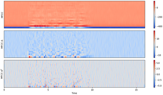 The time-domain signal is then transformed to the frequency domain using Fast Fourier Transform (FFT). A Mel filter bank, designed for speaker recognition, refines the spectrum. In the final step, the log Mel spectrum is converted back to time, yielding MFCC using logarithmic compression and discrete cosine transform (Equation (16)).