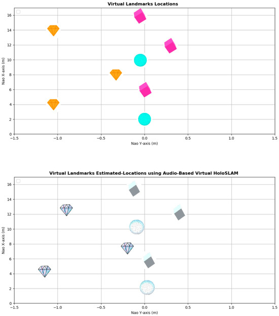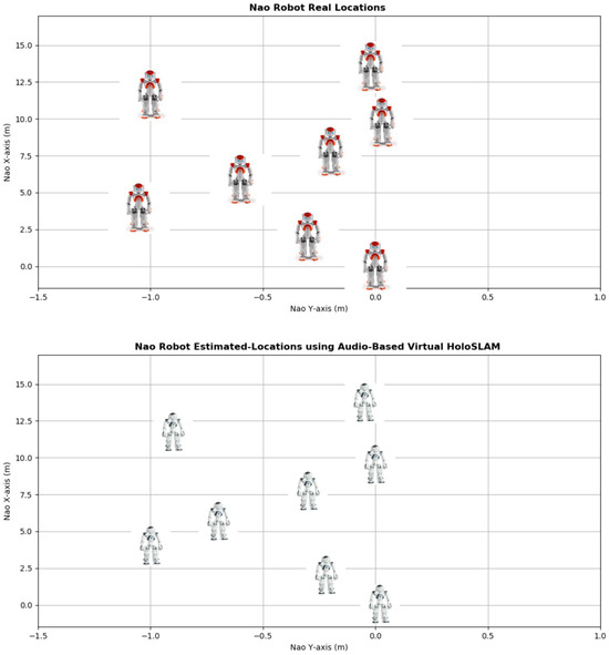 Mixed Reality (MR) offers a promising avenue to overcome the limitations of traditional landmark-based SLAM systems. By overlaying digital information onto physical surroundings, MR expands the perceptual capabilities of robots beyond tangible landmarks, allowing for more versatile mapping and localization. In MR-enhanced SLAM systems, virtual landmarks can be dynamically generated and manipulated, offering flexibility in adapting to diverse environments. These virtual landmarks may include not only visual cues but also auditory or spatial markers, aligning with the capabilities of audio-based SLAM methods. Additionally, MR and holographic displays facilitate the creation of interactive and immersive experiences, enabling robots to interact with both physical and virtual elements for enhanced localization and mapping accuracy [35]. Integrating Microsoft HoloLens or any other mixed-reality device [36,37] with a robot’s real-world environment enables the robot to effectively follow, track, communicate, and interact with specific speakers. Simultaneously, it empowers the robot to conduct a virtual audio-based SLAM with high accuracy and success, revolutionizing its ability to navigate and perceive its surroundings in dynamic and complex environments.