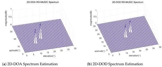 Figure 3 vividly illustrates the results of utilizing our RD-MUSIC method, demonstrating its effectiveness in estimating 2D-DOD and 2D-DOA in a bistatic MIMO radar system that incorporates UPAs based on the assumptions described earlier. The sharp peaks demonstrate the algorithm’s precise detection of the azimuth and elevation angles from which targets arrive. In Figure 3a, the 2D-DOA RD-MUSIC Spectrum is clearly visible in the peaks corresponding to the azimuth and elevation angles for the first target . This validates the algorithm’s precision in recognizing arrival angles in the multi-dimensional search space. In Figure 3b, the 2D-DOD RD-MUSIC Spectrum depicts the azimuth and elevation angles for the second target’s departure: . The algorithm’s sensitivity demonstrates its precision in estimating target departure profiles by precisely distinguishing DOD angles. The sharpness of the peaks in the spectrum is directly related to the resolution of the algorithm and more accurate angle estimation. Such precision can potentially improve target estimation in bistatic MIMO radar systems by achieving accuracy with reduced computational complexity.
