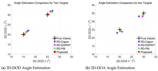 Here, a graphical representation is generated in Figure 4a,b to visualize the k sources that have been estimated with the proposed and other existing algorithms when , dB, , and at , , , , , respectively. The cross symbols represent the true values, whereas the solid points depict the estimated values generated by our proposed algorithm. The results in Figure 4 demonstrate that the proposed algorithm exhibits a higher degree of accuracy in estimating all sources.