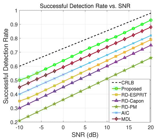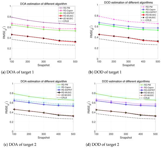 In the simulation, we present 1000 Monte Carlo simulations to assess the detection performance of the proposed RD-MUSIC algorithm. We normally adopt the bistatic MIMO radar system in the simulations with , , . The three non-coherent sources are all well-separated and located at the angles , , . AWGN channel is assumed. The CRLB = provides a bound on the variance of an unbiased estimator of a deterministic parameter , which supports the RD-MUSIC algorithm’s innovative dimensionality reduction technique.The simulation results provide insights into the algorithm’s performance under various scenarios and parameters, highlighting its accuracy and robustness compared to other existing algorithms.