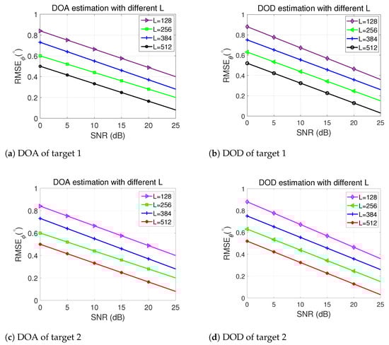 Figure 8 demonstrates the angle estimation performance of our proposed algorithm with M = N = 16, SNR = 15 dB, showcasing how this performance varies with different values of L. As observed, an increase in L directly correlates with a noticeable improvement in angle estimation accuracy. The results suggest that as the number of snapshots increases, the algorithm benefits from more accurate covariance estimation by (7), leading to better overall estimation accuracy. Furthermore, the results depicted in Figure 8 demonstrate that the proposed algorithm performs remarkably well even with smaller sampling sizes. This observation showcases the algorithm’s effectiveness across various scenarios, especially in situations where obtaining a large number of snapshots might be challenging or resource-intensive.
