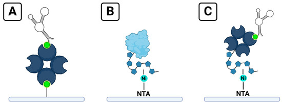 Another popular strategy for immobilization is capturing ligands tagged with a poly histidine tag (6xHis) onto a nitrilotriacetic acid (NTA)-functionalized surface primed with Ni2+ ions [4,14] (Figure 1B). 6xHis-Ni-NTA capture has some of the benefits of streptavidin–biotin immobilization, such as small tag size and directionality of attachment, but offers the ability to regenerate the ligand surface by disrupting the complex between 6xHis tags and NTA groups by using ethylenediaminetetraacetic acid (EDTA) to remove the Ni2+ ions necessary for binding [4,8].