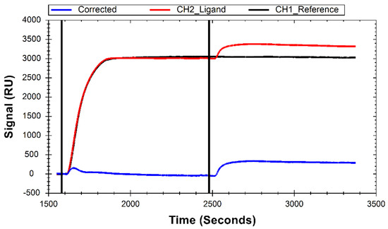 The immobilization level of His-SA was comparable for both the reference channel and the ligand channel prior to B-29mer immobilization, and the corrected signal of B-29mer was similarly reproducible across three repeated immobilizations. The coefficients of variation for each set of replicates ranged from 3.9% to 9.5%, as reported in Table 2, validating the use of this system to immobilize multiple biotinylated ligands to the same chip.