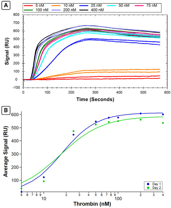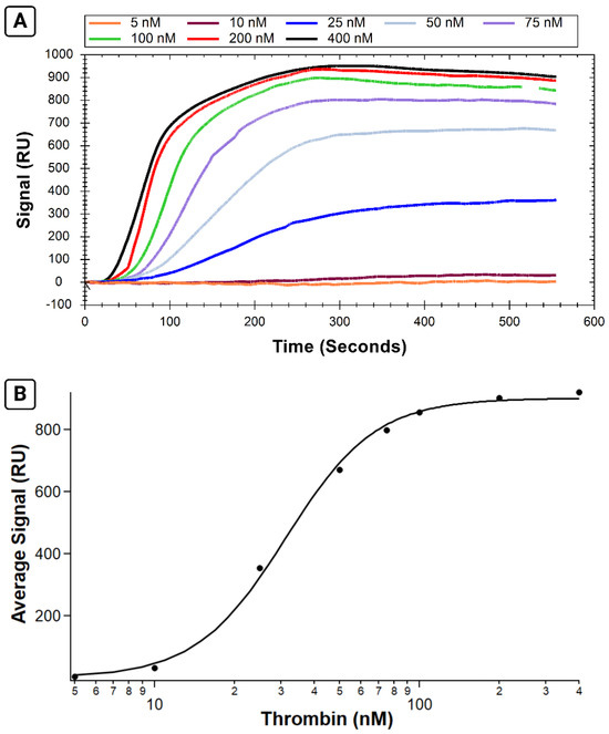 Following successful immobilization of B-29mer, the binding of a series of thrombin concentrations was measured. Sensorgrams of the corrected signal for each thrombin concentration are shown in Figure 3A, with the binding isotherm shown in 3B. Thrombin binds rapidly to the aptamer immobilized on the surface, as seen in the association phase as protein is injected into the flow cell for the first 300 s. Following analyte injection, the instrument switches to running buffer, and the slope trends slightly downwards as protein slowly dissociates off the aptamer.