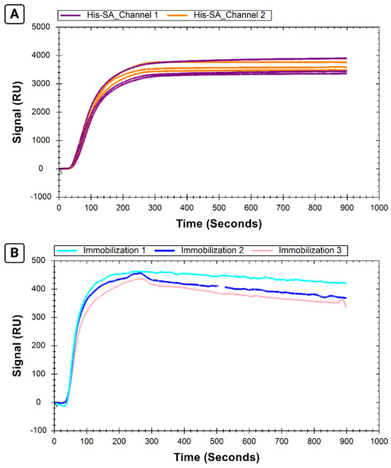 We observed reproducible immobilizations of both His-SA protein (Figure 4A) and B-29mer (Figure 4B) when we compared triplicate immobilization cycles performed on the same chip.