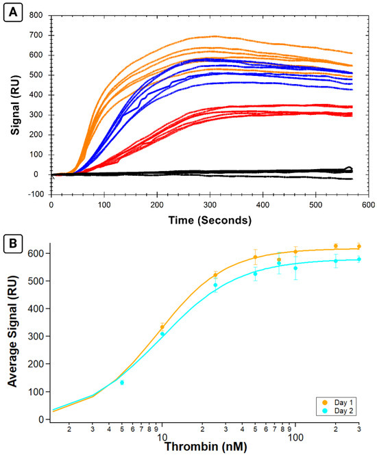 The reproducibility of replicate ligand immobilizations on a chip lends confidence to individual assays as variability in ligand immobilization can cause variation in measurements of analyte binding [23]. The ability to use a chip for multiple immobilizations increases throughput. However, being able to use the same surface multiple times before regeneration would be beneficial for several reasons, including the conservation of precious samples as well as saving time by running more analyte samples before needing to repeat immobilization steps. Biotin–streptavidin immobilization enables stable binding, and we wanted to establish that this stability was not lost when biotin–streptavidin coupling was combined with reversible immobilization on an NTA chip. Figure 6 demonstrates that similar signals are obtained from thrombin samples run on the same immobilized B-29mer surface on the second day after leaving it on standby overnight in the instrument. Experiments 5 and 6 were an initial scouting experiment undertaken to determine the feasibility of using the same immobilized surface on two separate days, and very similar binding signals can be seen in Figure 6A.