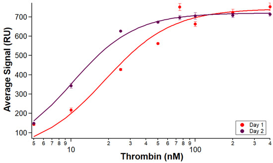 While the KA values for all the experiments are not identical, we know from Mears et al. that a wide range of KA and Kd values have been reported for the thrombin binding aptamers across buffer conditions and between experimental methods [18]. The KA for Experiment 1 at 31.2 nM was the highest, but the spread of binding constants calculated fall within the expected range for thrombin–aptamer binding, both within the literature values and compared to the typical results we see in house for this experiment [18]. The main difference between the KAs calculated in this paper and the data observed by Mears et al. [18] is that the SPR results tend to have a lower KA on average, but this is in keeping with their observation that different experimental methods measure slightly different bindings. The two main methods reported by Mears et al. [18] are fluorescence anisotropy and affinity probe capillary electrophoresis, which measure analyte binding free in solution. Because our values are close to those reported in the literature (with slightly higher affinity, in most experiments), this increases the confidence in our immobilization method. The immobilization of an aptamer on the sensor chip surface for up to two days does not affect the ability to reproducibly measure the binding affinity between thrombin and the thrombin-binding aptamers, reinforcing that the surface is stable and reliable.