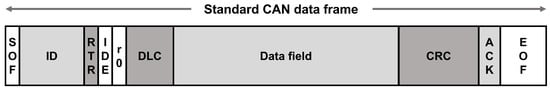The Controller Area Network (CAN) bus is a serial communication protocol engineered for real-time control systems in vehicles [32]. The majority of sensors, actuators, and processors within a vehicle communicate through this network, which employs twisted differential-pair lines to enhance noise and error resilience. The CAN message format is designed based on two criteria: the standard frame, as defined by CAN 2.0A, and the extended frame, outlined in CAN 2.0B. Figure 2 shows the standard CAN data frame. The CAN bus operates on two voltage levels, termed “dominant” (corresponding to a digital “0”) and “recessive” (corresponding to a digital “1”). In situations where multiple nodes attempt simultaneous transmission of conflicting signals, the “dominant” voltage level prevails, ensuring that a digital “0” supersedes a digital “1”. Importantly, all the nodes in this network function as masters, permitting any node to initiate a data transmission when the bus is idle. During the arbitration phase, the bits of this identifier are compared and resolved from the most significant bit (MSB) to the least significant bit (LSB). Specifically, nodes transmitting a “0” continue their transmission while those transmitting a “1” switch to a receiving mode. This mechanism ensures that the CAN node with the lowest message ID invariably completes transmission without interruption.