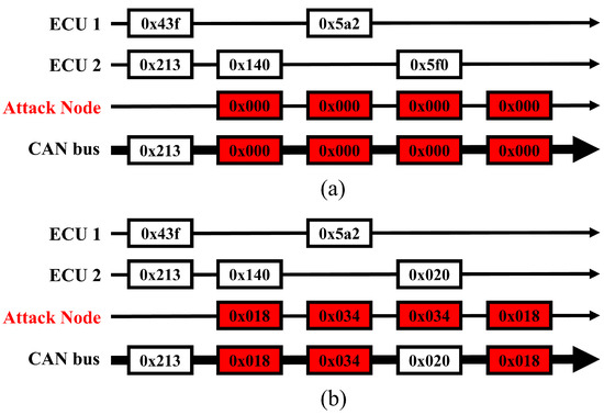 During a DoS attack on a CAN bus, the attacking node aggressively dominates the communication bus. This is achieved by sending frames with exceptionally high priority, typically represented by a message ID of 0x000 or another value that is comparably low, as shown in Figure 3. The simplest DoS attack type is performed using the highest priority ID, as shown in Figure 3a. Park et al. [33] introduced an advanced DoS attack, shown in Figure 3b, which has a sufficiently high message ID to dominate the CAN bus. This attack method is designed to exploit the priority-based arbitration of the CAN protocol, in which lower message IDs have higher priority. In this way, the attacker can launch a DoS attack even with minimal pre-existing knowledge.