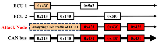 In spoofing attacks targeting the CAN bus, the assailant undertakes a thorough preliminary analysis of the CAN traffic, as shown in Figure 4. This pre-attack phase involves the close monitoring and recording of bus traffic, with a particular focus on identifying message IDs that correspond to the functionalities of different subsystems. Consequently, in order to execute a spoofing attack the attacker must possess a detailed understanding of the CAN bus operation. When the attack commences, the attacker continuously transmits data frames with the same payload, inducing system malfunctions.