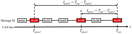 In instances of vehicular hacking, attack frames are surreptitiously injected into the CAN bus of a vehicle. As a consequence of this signal injection, alterations occur in the sequential pattern of CAN IDs [10,21,22,25]. Accordingly, in this study, ML-based IDS variants were trained using temporal intervals associated with identical CAN IDs, as shown in Figure 6. Specifically, two temporal intervals, , , were employed as features for training. Here, and denote the timestamps of the current frame, immediate prior frame with the same message ID, and penultimate frame with the same message ID, respectively. It is important to note that .