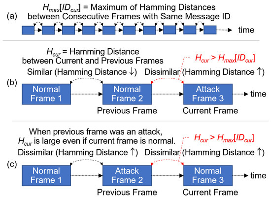 Hamming distance between two consecutive payloads with the same message ID. (a) searching for between consecutive frames with the same Message ID; (b) current frame attack detection by Hamming distance exceeding ; (c) normal frame exhibiting Hamming distance exceeding .