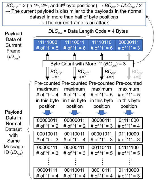 As shown in Figure 9, the number of “1” bits in the current payload data is enumerated in terms of the respective byte positions. When the number of “1” bits in any byte of the current payload exceeds the predetermined maximum for that specific byte position in the normal dataset, increases by one for that particular position. The total number of bytes in the payload data of the current frame is denoted as . If , then it can be inferred that the current payload is substantially dissimilar from the payloads in the normal dataset for over half of the byte positions. Therefore, the current frame is classified as an attack because of its significant dissimilarity to normal frames. It is imperative to note that, according to Rule 2, a frame is identified as an attack only if both Conditions (1) and (2) are satisfied.