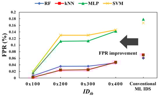 Figure 10 shows the false positive rate (FPR) of the four ML-based IDS, highlighting how the performance of these systems is influenced by the threshold . According to the experimental results, if is set to 0x400, the FPR increases to an average of approximately twelve times higher than when is set to 0x100. Therefore, should be appropriately determined based on the ID settings used in actual vehicles, as it influences the performance of our proposed cross-check system. The empirically determined threshold was optimized through simulation and established at 0x100 for the performance comparison of the ML-based IDS variants conducted in this study.