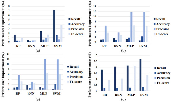 Performance improvement of ML-based IDS: (a) DoS attack; (b) gear spoofing attack; (c) RPM spoofing attack; (d) fuzzy attack.