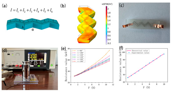 Place single-channel sensor samples with different bending angles α (shown in Figure 2c) on the test bench. Place weights of varying masses on the sensors, and then use an LCR meter (IM3533-01) to measure the resistance values of the sensors (as shown in Figure 2d). Figure 2e shows the resistance values of the sensor at bending angles α of 180°, 160°, 140°, 120°, 100°, and 80°. As the α decreases, the sensor’s sensitivity increases. However, as α continues to decrease, the relationship between stress and resistance becomes increasingly nonlinear. This is consistent with findings in reference [34], which suggest that increasing the contact area to enhance sensitivity leads to nonlinear sensor readings. When α is greater than 120°, the sensor readings maintain good linearity. Therefore, this study proposes a bending angle α of 120° for the channels of the four-channel tactile sensor for optimal performance.