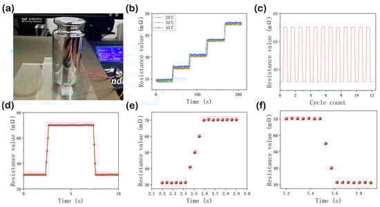 (a) illustrates the compression experiments conducted with the tactile sensor placed on a heating stage. (b) depicts the resistance changes in a single channel under the influence of multiple pressures at different temperatures. (c) shows the impact of continuous repetitive pressing on the readouts of a single channel of the sensor. (d) tracks the fluctuations in the sensor’s readings over a 10-s cycle. (e,f) display the rise and fall of the sensor’s readings within a cycle, reflecting the sensor’s response time (0.2 s) and recovery time (0.15 s).