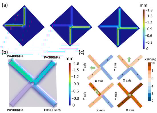 The relationship between stress and deformation in pressure sensors is simulated using COMSOL Multiphysics 6.0 software. The parameters of the model are 10 mm × 10 mm × 2 mm. It features a single zigzag channel inside, with a length of 6 mm, a width of 1 mm, and a height of 1 mm. Each channel has a stressed surface above it, measuring 4.8 mm in length and 2 mm in width. Apply pressure at different positions above the tactile disk of the four-channel tactile sensor. Each channel of the tactile sensor will experience various deformations, as shown in Figure 4a. Figure 4b displays the deformation of the contact surfaces when the four channels of the tactile sensor receive pressures of 400 Pa, 300 Pa, 200 Pa, and 100 Pa, respectively. The results show that each channel produces a different resistance response when the sensor is subjected to forces from different directions. By measuring the resistance of each channel after force application, touch can be fully sensed, and the size and direction of the force can be distinguished. The direction and quadrant of the load under different conditions can be obtained by analyzing the stress from the four channels of the sensor, as illustrated in Figure 4c.