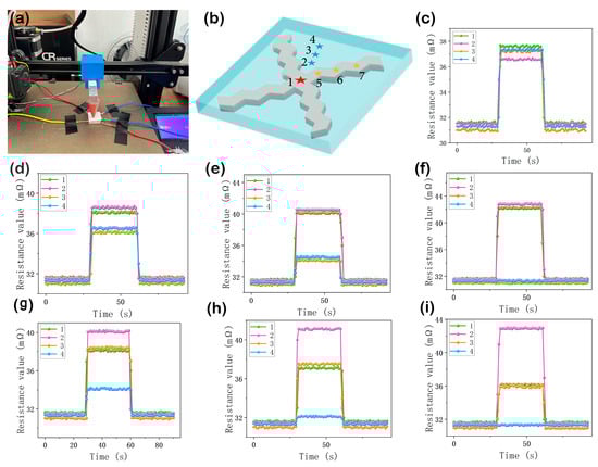 (a) Experimental setup. (b) Schematic diagram of experimental points. (c) Variation in resistance values of the four channels when a force of 3.5 N is applied at the center of the four-channel tactile sensor. (d–f) Variation in resistance values of the four channels when a force of 3.5 N is applied at points 2, 3, and 4 of the four-channel tactile sensor, respectively. (g–i) Variation in resistance values of the four channels when a force of 3.5 N is applied at points 5, 6, and 7, respectively.