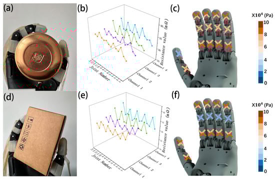 The study collected 56 resistance value signals from the four-channel tactile sensors on a total of 14 joints of the robotic hand in the above two conditions. These sensors, proposed in this research, exhibit excellent stability. The mean values of each channel were calculated after stabilization, and are shown in Figure 6b,e. The variation in sensor resistance values on each joint corresponds to different stresses they experience, which match conclusions drawn from visual observations for underactuated robotic hand stress, as depicted in Figure 6c,f. Thus, the tactile sensor proposed in this study can effectively perceive the force exerted on robotic fingers, offering crucial guidance for future research on robotic hand grasping and object recognition through tactile feedback.