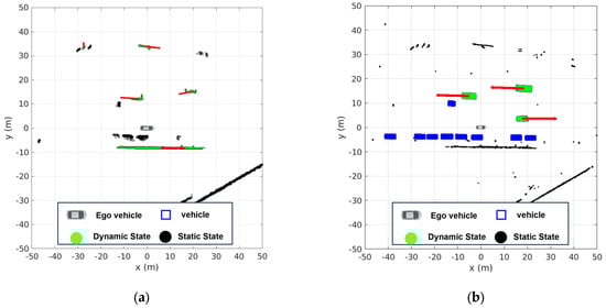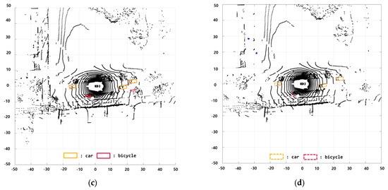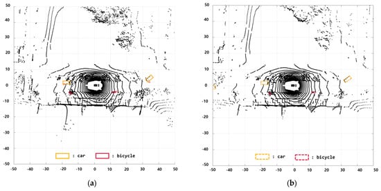 In this scenario, various types of objects such as cars, pedestrians, and bicycles are commonly found in urban areas. Furthermore, there are both dynamic objects, such as cars and pedestrians, and static objects, such as traffic cones. The specific situation involves the ego vehicle traveling in a straight line, followed by a bicycle from behind. In this study, various objects were detected using a 3D object detection method called BEVFusion. Figure 7 shows the results validated using the nuScenes dataset with BEVFusion. The results demonstrate detection performance not only for large vehicles, but also for smaller objects such as bicycles and traffic cones. Figure 8 presents the BEVFusion results in the BEV format, showing stable detection even for objects located beyond 50 m. This demonstrates robust detection performance in complex urban environments with multiple vehicles. To further analyze the performance, we compared two cases based on the occupancy state of the bounding boxes using BEVFusion’s 3D object bounding box as input for the sensor fusion DOGM.