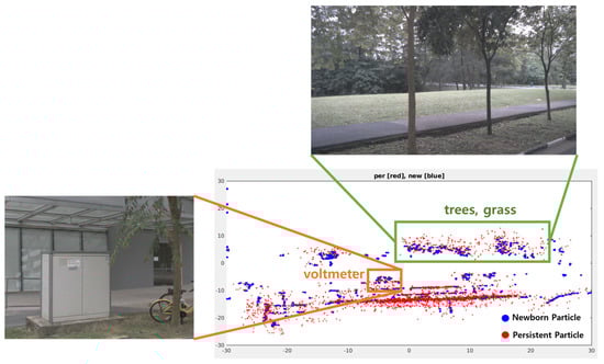 In general, it is computationally expensive to maintain a large number of particles to represent a complex map. However, as shown in Figure 3, a substantial portion of the surviving particles are drawn towards static objects, such as bushes, trees, and buildings, leading to fewer surviving particles being allocated to dynamic objects. This phenomenon makes it challenging to maintain stable velocity estimation performance for moving objects, resulting in the misclassification of static objects as dynamic and a decrease in the accuracy of object velocity estimation.