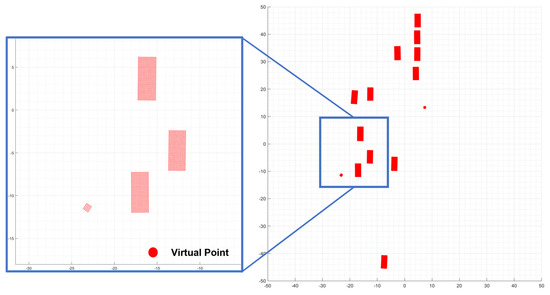 Additionally, an environmental perception map was created using LiDAR points that were not classified as movable labels. The developed grid map classified dynamic and static objects in urban environments while extracting semantic information about dynamic objects, such as vehicles, motorcycles, bicycles, and pedestrians. To find the grids belonging to the OBB generated by 3D object detection, virtual points were created within the bounding box using the coordinates of the four vertices, as illustrated in Figure 4. The virtual points () consist of the x and y coordinates (), the centroid x and y coordinates of the detected object (), the yaw angle (), and the label information (). Similar to how LiDAR point clouds occupy grids, the virtual points within the bounding box assign occupancy probabilities to the DOGM.