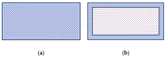 Figure 5a shows the SBBUM, which assigns a uniform occupancy probability to the grids corresponding to the box area; and Figure 5b shows the EBBUM, which assigns occupancy probability only to a specific region corresponding to the box border. The thickness (T) of the border was set to 0.4 m, considering a sufficient number of particles to represent the shape of the vehicle and the grid size of the grid map.