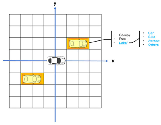 At time t, the state of the grid map is updated using particle filters. When there are particles associated with the occupied grid cell c, the particles at time t include information such as their coordinates , weights and label weights . These are used to assign Occupancy mass ( and Label mass ( using (2).