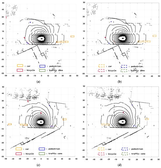 BEVFusion results with LiDAR measurements: (a,c) nuScenes ground truth; (b,d) BEVFusion results.