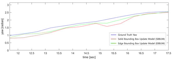 Figure 17 compares the direction estimations between the SBBUM and EBBUM. The SBBUM exhibited small errors in estimating the direction at the beginning. However, after 4.5 s, the vehicle following the ego vehicle started to rotate, and the velocity estimation results of the EBBUM converged faster to the ground truth direction than those of the SBBUM. In this result, the SBBUM had a mean absolute error of 0.153 radians, whereas the EBBUM reduced the error by 37%, resulting in 0.097 radians. This reduction in errors is attributed to the faster convergence of the direction estimates to the ground truth during the turn.
