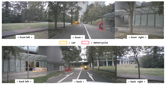 The main sensors in the nuScenes dataset include one 32-channel LiDAR, six cameras, and one radar. Table 1 explains the specifications of the sensors in the nuScens data set. The dataset contains measurements from the LiDAR, updated at 20 Hz, and six cameras with a resolution of 1600 × 1200 pixels, captured at 12 Hz [22]. The nuScenes dataset comprises scenarios acquired in complex urban areas in Boston and Singapore. It comprises 1000 scenes, each lasting approximately 20 s, and includes labeling for 23 classes such as car, bus, bicycle, motorcycle, pedestrian, and barrier. For validation and analysis, two scenarios were selected: one with a dense forest and pond, and another with multiple objects, including bicycles.