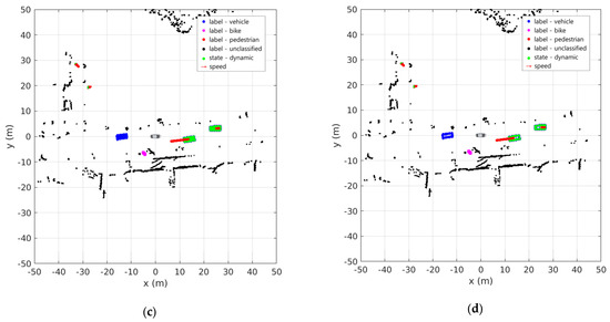 DOGM with semantic information results of scene no. 98 using (a,c) SBBUM and (b,d) EBBUM.