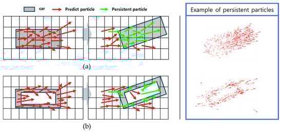 In Figure 15a compares predicted and persistent particles when the SBBUM is used, and Figure 15b shows the particles when the EBBUM is used. In the SBBUM’s case, the predicted particles within the object bounding box maintain their original direction even when the object rotates. This can lead to delayed convergence to the ground truth, resulting in many estimation errors in the orientation when the object is making a turn. To improve convergence, the proposed EBBUM in Figure 15b assigns probability only along the edge of the bounding box to help the survival of the predicted particles aligned with the direction of the OBB measurement. Consequently, particles predicted in the direction of the original motion are eliminated because the EBBUM assigns a low probability mass inside the bounding box. However, particles predicted in the direction of object rotation are more likely to survive, resulting in better accuracy of the velocity estimations of rotating objects. Therefore, it is expected that the EBBUM will provide a more accurate direction estimation of an object than the SBBUM, especially when the object is making turns.