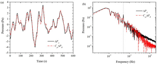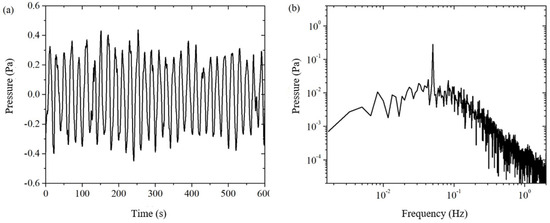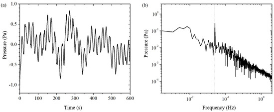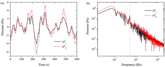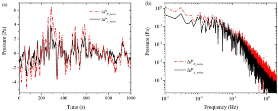 in terms of amplitude. We made several measurements and found that the time-domain signals of both pressure sensors have nearly identical waveforms but different amplitudes. This shows a good correlation between the background noise of the two pressure sensors. From the frequency domain signal in