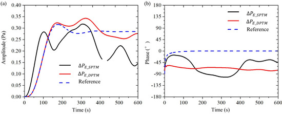 Figure 10a shows three amplitude curves of the lock-in amplifier LIA output. (1) The output data of the reference group (dashed line), first increases rapidly from zero, then oscillates, and finally stabilizes at 0.285 Pa. This indicates that the sinusoidal input signal is detected by the lock-in amplifier with a magnitude of 0.285 Pa and no noise. (2) The output data of the Double + LIA method (red solid line), first increases rapidly from zero, then oscillates between 0.25 and 0.34 Pa, and finally settles at 0.275 Pa. This indicates that the electroosmotic pressure signal has an amplitude of about 0.275 Pa with little noise. (3) The output data of the Single + LIA method (black solid line), first increases rapidly from zero, then oscillates between 0.13 and 0.32 Pa, and finally fluctuates approximately sinusoidally between 0.13 Pa and 0.225 Pa. This indicates that the electroosmotic pressure signal has an amplitude of about (0.13 + 0.225)/2 Pa ≈ 0.18 Pa and has a large amount of noise. Comparing the red solid line with the black solid line, it can be seen that the signal-to-noise ratio of the Double + LIA method is better than that of the Single + LIA method.