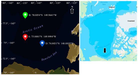 The study area is located in the Beaufort Sea in the Arctic Ocean, west of McClure Sound and north of Alaska. The study area is shown in Figure 1, where red, green, and blue dots represent upward-looking sonar (ULS) points A, B, and D, respectively. The top right corner of Figure 1 provides a small map, with a black arrow indicating the location of the Beaufort Sea in the Arctic. The area covers latitude 70° north to 80° north and longitude 160° west to 125° west, and the study period spanned from 14 September 2018, to 7 September 2021. The Beaufort Gyre Observing System (BGOS) has provided means for the continuous monitoring of the region since the summer of 2003, providing us with time series regarding temperature, salinity, ice draft, etc. [14].