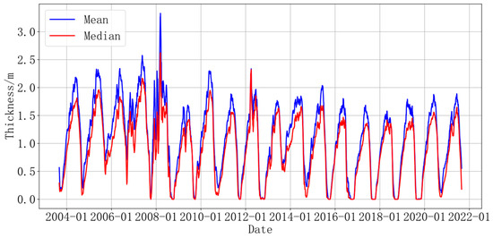 where t represents the day number, dt represents the thickness of sea ice on the t-th day, and Dt represents the smoothed thickness value of sea ice on the t-th day, a value obtained by averaging the thickness values from the t − 9th day to the t + 10th day. From August 2003 to August 2021, the mean and median changes were cyclical. The maximum value of the mean is more than 200 cm, and the lowest is 0 cm. When the ice thickness was at its maximum during this phase, the zigzag of the lines varied greatly, and the maximum average value of each season after 2013 was lower than the pre-2013 value. More importantly, the red lines zigzag less than the blue lines, and the median is more stable, during both ice growth and ice melting.