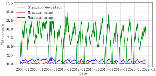 Figure 3 shows the daily ice thickness change for sonar device A from August 2003 to August 2021. The data were also processed with a median moving average, with the maximum, minimum, and standard deviation values represented by green, red, and blue lines, respectively. The maximum daily ice thickness is more than 400 cm, and the interval between maximum values during each phase is about 1 year. The daily minimum thickness is no more than 40 cm, and the trend did not change significantly after 2013, being basically close to 0 cm. The difference between the maximum and minimum daily thickness values is very large, reaching 16.7 m in March 2008, but the difference between 2007–2009, 2012, 2015, 2017, 2018, and 2019 is very small and is close to 0 cm in August–October. The standard deviation indicates the dispersion degree of the sea ice thickness change. The standard deviation fluctuates around 1 m from August to October, and the dispersion degree is greater in other months.