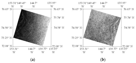 As shown in Figure 4, the SAR image covering sonar equipment A (14 January 2021) was processed. Figure 4a shows that before preprocessing, the brightness of the image decreases significantly from right to left [16,17]. The backscattering trend of signals received in EW mode is weakened in the distance direction, seriously affecting the ability to invert sea ice thickness from wide SAR images. Thus, the correction of angle of incidence is particularly important. Figure 4b shows that, after pretreatment, the brightness of the region with a large incidence angle was significantly improved, and the overall brightness was less affected by the incidence angle.